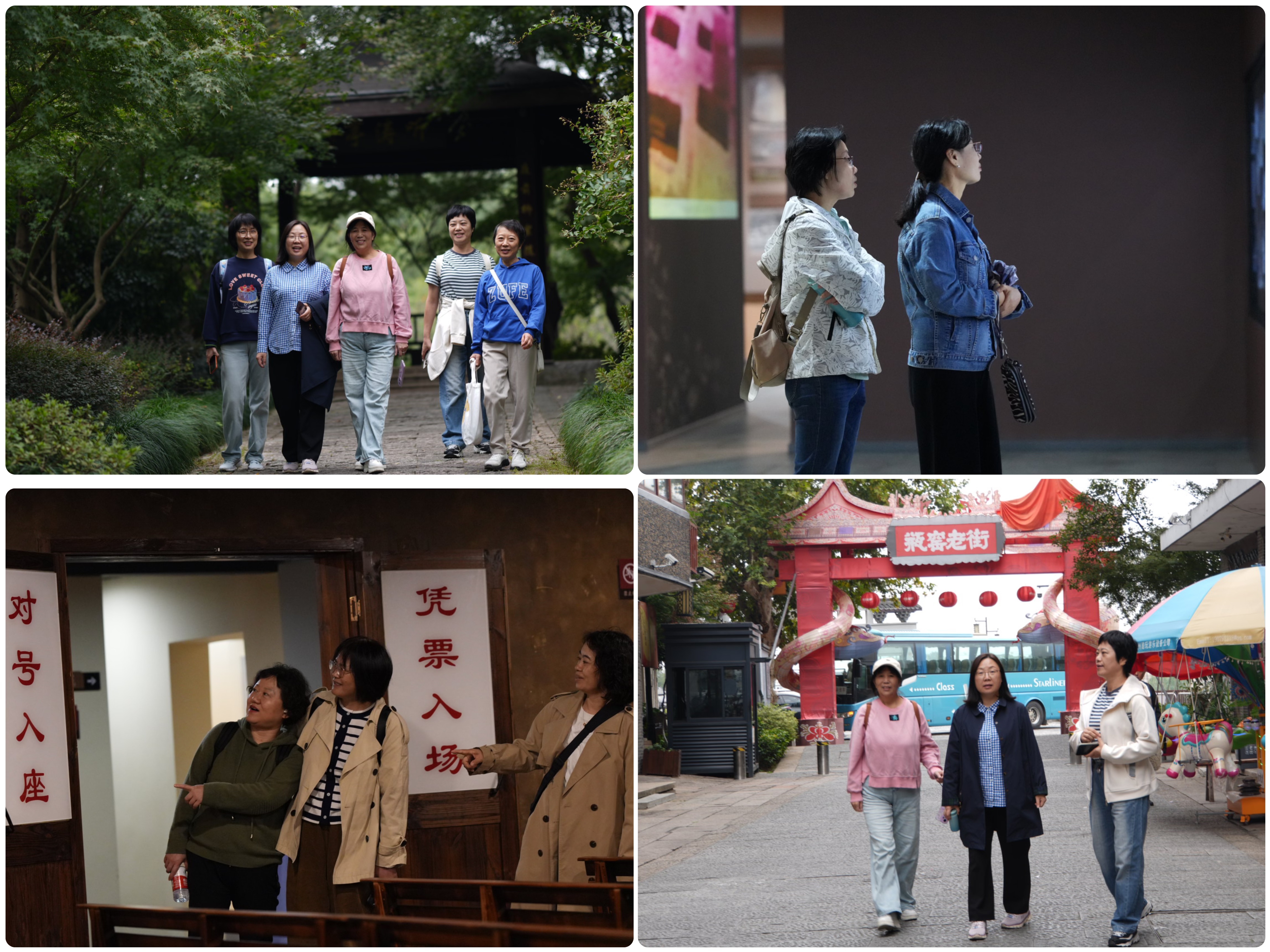 活动首站来到瓶窑老街。苕溪水缓,南山如屏,保留完整的“解放风”建筑群静静伫立,仿佛时光在此驻足。老师们在老式影院前合影,于传统茶舍品茗叙旧,漫步青石巷弄,闲话岁月往事,在秋阳的温柔映照中尽享悠然时光。