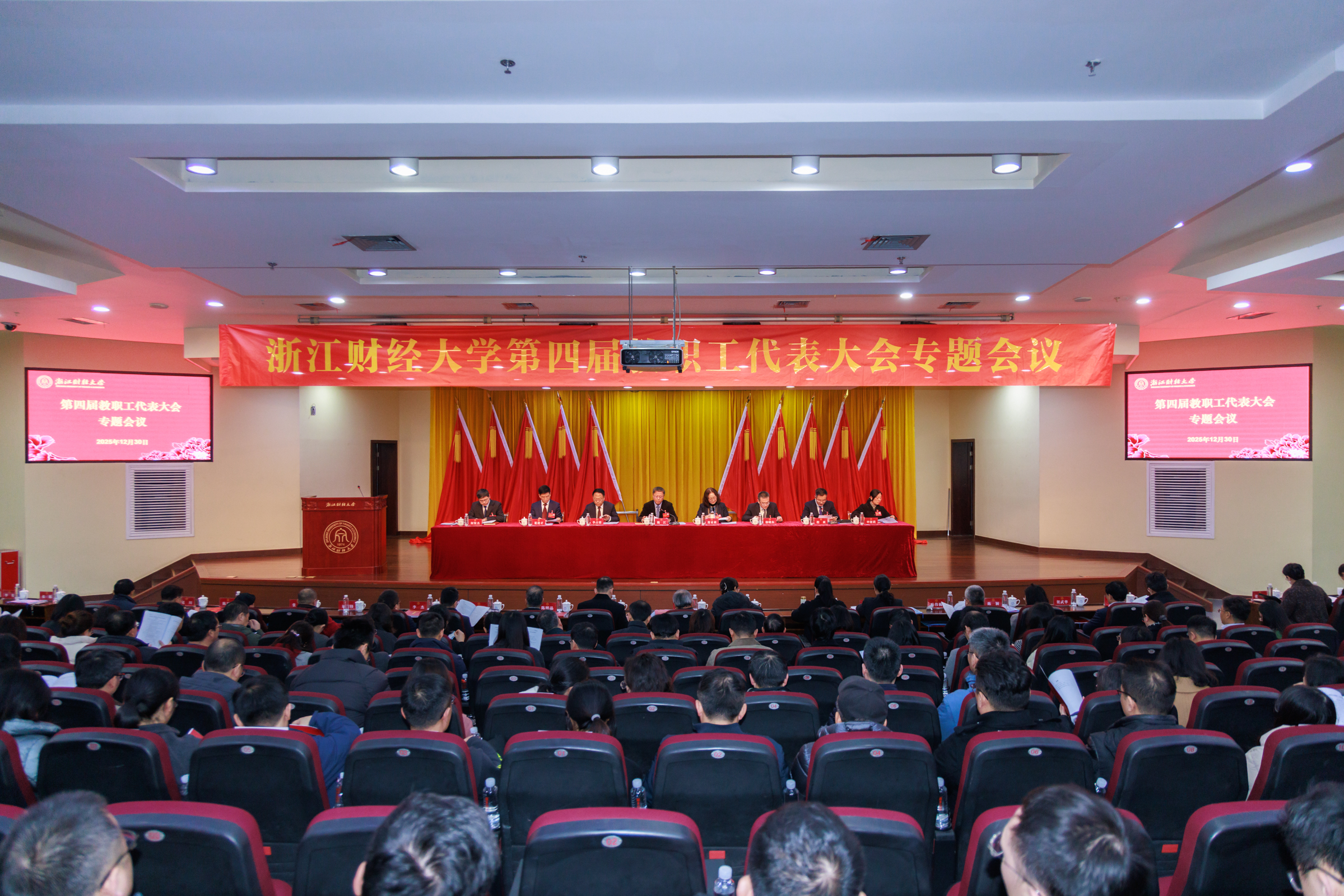 12月30日,浙江财经大学第四届教职工代表大会专题会议在下沙校区召开。本次会议是在全校上下深入贯彻落实党的二十届四中全会精神、阔步迈向“十五五”新征程的关键时期召开的一次重要会议。205名正式代表出席会议,特邀代表和部分中层干部列席会议,代表们以高度的使命感和责任感共同谋划学校发展大计。校党委副书记程爽主持会议。
