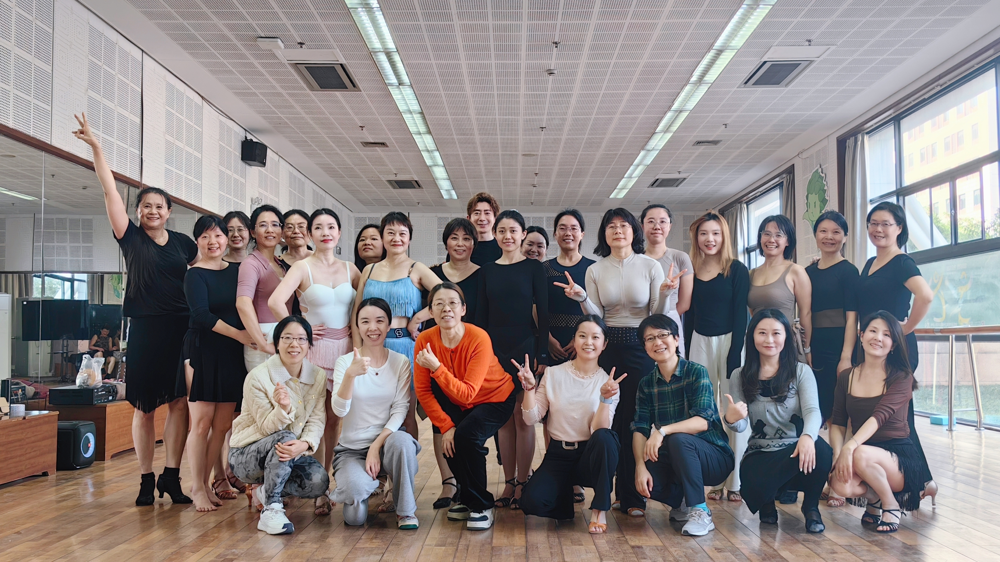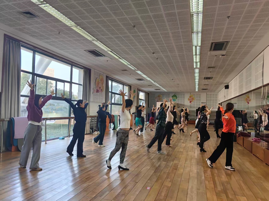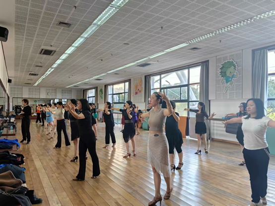 活动伊始,在我校协会会员的热烈欢迎中,双方迅速破冰。在舞蹈老师姚炫宇的带领下,交流活动以一场别开生面的联合训练课展开。从拉丁舞基础步法的默契配合,到成品舞段的优雅共演,平日耕耘于三尺讲台的教师们,此刻化身舞池中灵动翩跹的舞蹈精灵,她们在明快的节奏中挥洒汗水,在默契的互动中切磋技艺,充分展现了高校女教职工在严谨治学之外,对生活之美与身心健康的不懈追求,其洋溢的热情与自信的风采感染了现场每一个人。