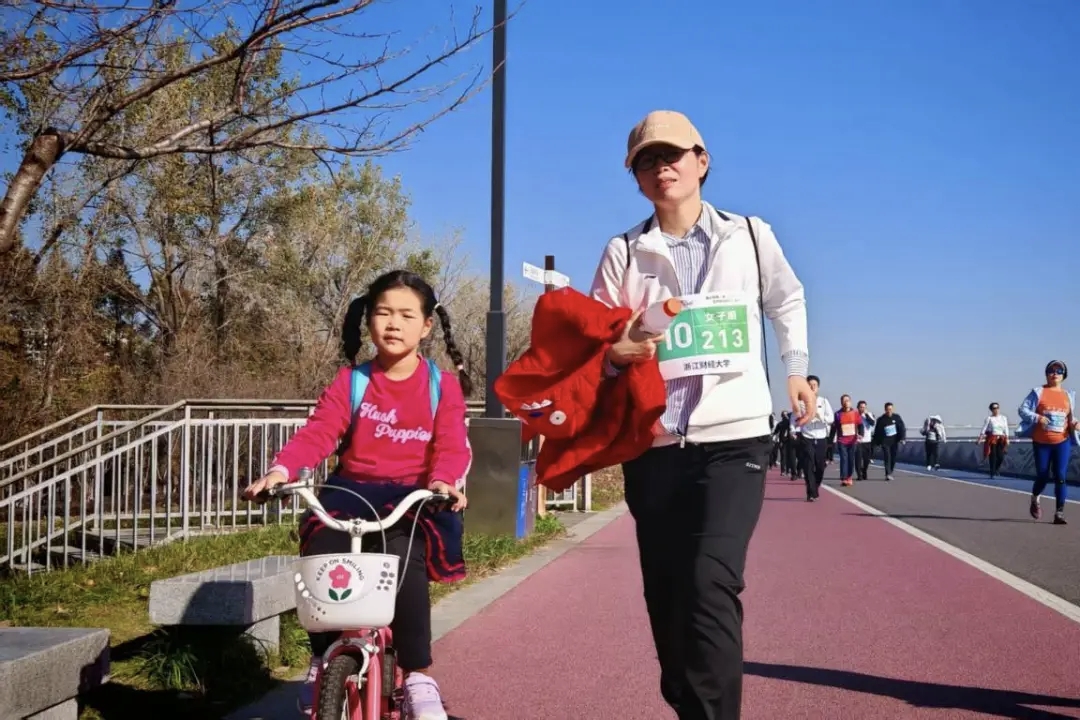 队伍中既有连续两届参赛的“老朋友”,也有首次加入的“新面孔”。程小英老师是第二年参加活动了,她说:“去年参加以后感觉非常棒,今年就带着孩子一起参加,希望她也多走到户外,爱上运动。”小女孩蹬着小自行车紧随母亲身旁,笑容灿烂。这温馨一幕,正是我校教职工健康生活、家校共育理念的生动写照。