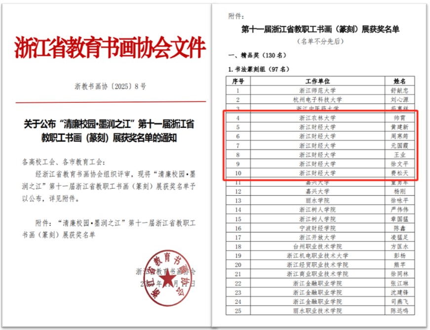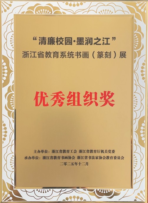 12月16日,“清廉校园 墨润之江”浙江省教育系统书画(篆刻)展在杭州下沙开幕。本次展览由浙江省教育工会、省教育厅机关党委联合主办。我校黄建新、徐文平、元国霞、王业、周寒筠、李煜华夏、曹煜、费松平等八位教师的作品成功入选展览,其中六位获“精品奖”,一位获“入展奖”,一位获“入选奖”,学校获“优秀组织奖”。
