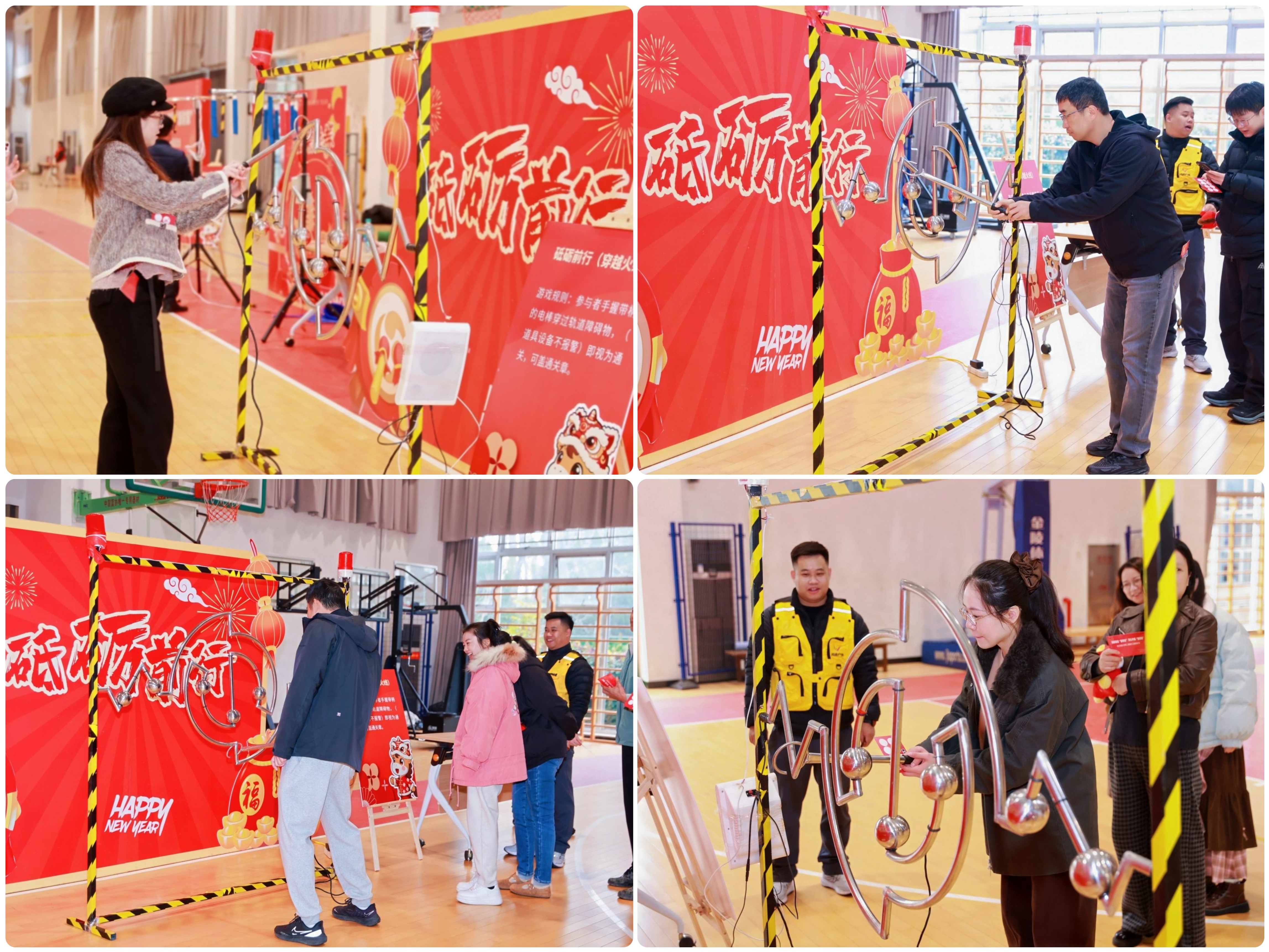 作为本次嘉年华的核心环节,八大游园关卡“财运滚滚来”“幸运转圈圈”“稳操胜券”“一箭中财”“乒乓接福”“砥砺前行”“财智生辉”“一路生花”各具特色,吸引着老师们踊跃参与、各显神通。“财运滚滚来”滚铁环项目中,10 米赛道上,铁环咕噜噜滚动,不仅滚来了满满的财运寓意,更唤醒了老师们心中的童年记忆,欢声笑语此起彼伏;“幸运转圈圈”项目,老师们挥鞭抽打陀螺,看着陀螺稳稳当当连续旋转,那份掌控感与成就感溢于言表;“稳操胜券”考验着大家的反应速度,紧张刺激的节奏让现场不时响起阵阵惊呼;“一箭中财”射箭项目前,老师们凝神聚力、拉弓瞄准,五箭中三箭的通关标准难不倒身手矫健的浙财人,每一次命中都引来阵阵喝彩;“乒乓接福”趣味十足,30秒内将5个乒乓球成功投中,看似简单却暗藏技巧,大家屏息凝神、精准投掷,享受着运动带来的快乐;“砥砺前行”穿越火线项目极具挑战,老师们手握电棒小心翼翼穿过轨道障碍物,全程保持设备不报警,充分展现了沉稳细致的处事风格;“财智生辉”猜灯谜环节则是脑力比拼的舞台,一道道妙趣横生的灯谜,被学识渊博的老师们轻松破解,两题猜中即可通关的设定让大家收获满满成就感;“一路生花”滚滚乐项目充满童趣,老师们在指定地点将可乐瓶稳稳滚到目标位置,简单的游戏却带来了纯粹的欢乐。大家三五成群、结伴闯关,集齐三个通关印章后,便兴冲冲地兑换心仪的纪念品,每张脸上都洋溢着幸福的笑容。